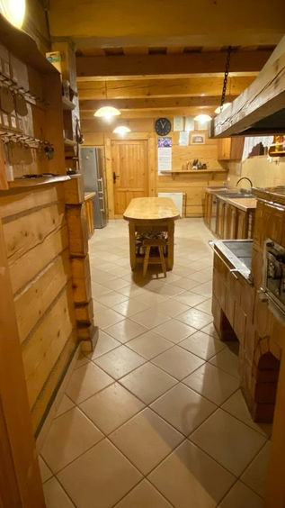 Na parterze do dyspozycji Gości pozostaje duża sala kominkowa, mieszcząca około 40 osób, idealna do wspólnych spotkań i uroczystości. Obok znajduje się przestronna, w pełni wyposażona kuchnia, obejmująca kuchenkę gazową o szerokości 90 cm, piekarnik oraz tradycyjną kuchnię kaflową.